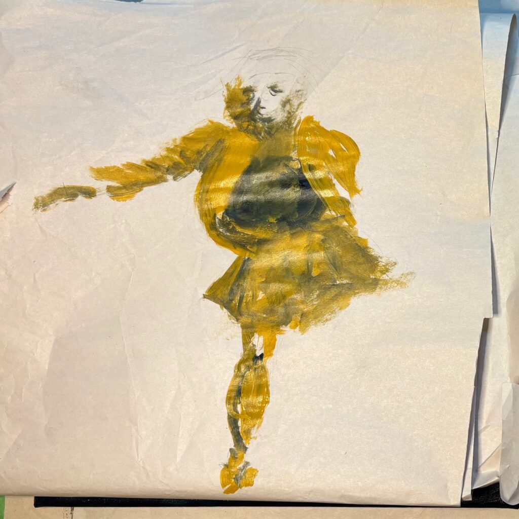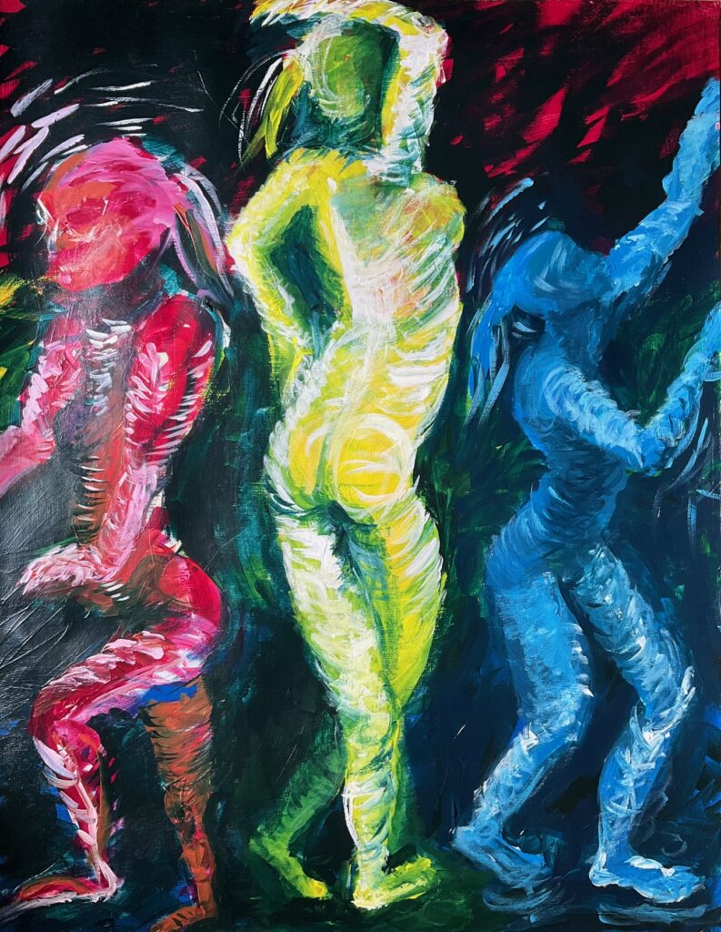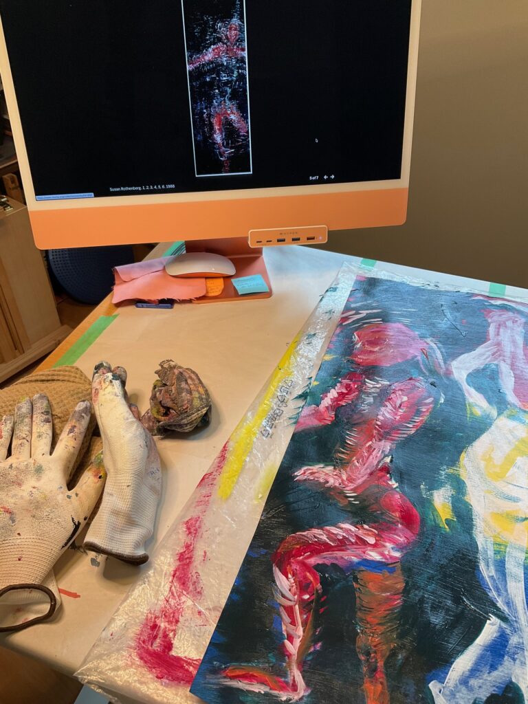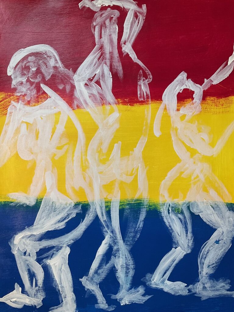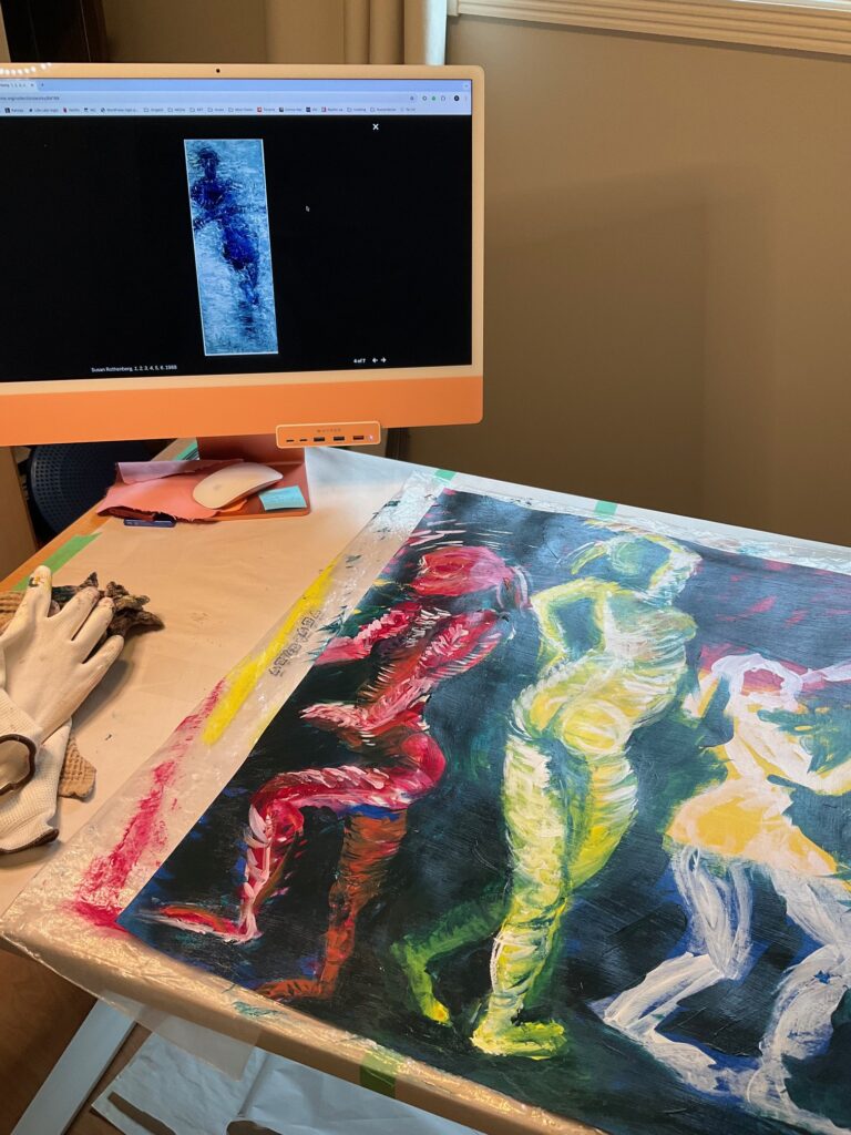 Rothenberg’s dancers (1, 2, 3, 4, 5, 6) inspired me to see if I could catch some sense of the movement in her figures. She uses short layered directional brushstrokes (often spiral or back-and-forth) in the core of the figures and at the edges, often extending out into space beyond the figure. Also, the figures are loosely defined, at times their edges bleed into the background or vice versa. For my technical play, I painted a 20″ x 26″ page in primary colour bands then made 3 gestural figures (one-minute views from an online model shoot) in white paint. I kept one or another of Rothenberg’s dancers up on my computer screen for inspiration while I created a red, yellow then blue version of my gesture drawings, much coarser strokes than hers but aiming to borrow some of her movement sense.