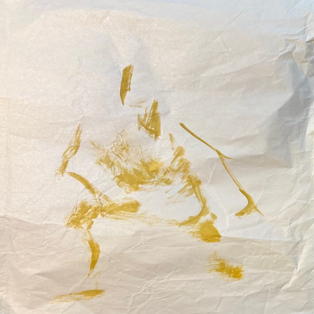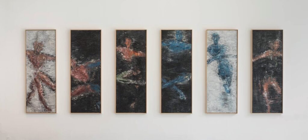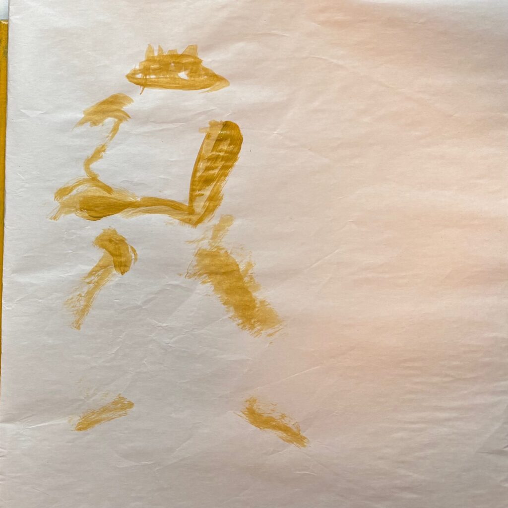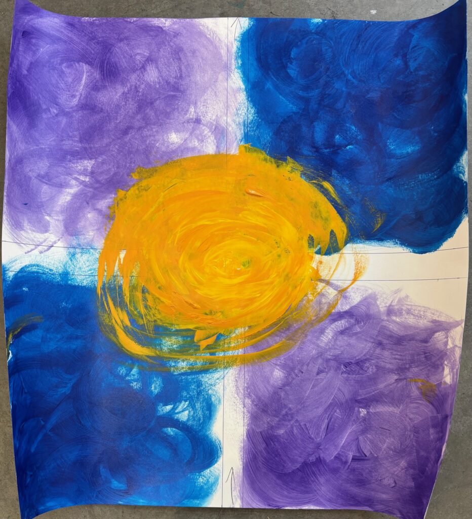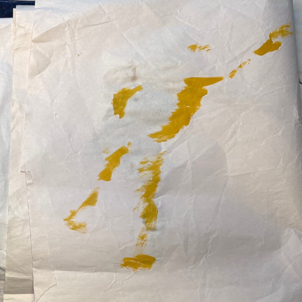 Rothenberg’s dancers (1, 2, 3, 4, 5, 6) inspired me to see if I could catch some sense of the movement in her figures. She uses short layered directional brushstrokes (often spiral or back-and-forth) in the core of the figures and at the edges, often extending out into space beyond the figure. Also, the figures are loosely defined, at times their edges bleed into the background or vice versa. For my technical play, I painted a 20″ x 26″ page in primary colour bands then made 3 gestural figures (one-minute views from an online model shoot) in white paint. I kept one or another of Rothenberg’s dancers up on my computer screen for inspiration while I created a red, yellow then blue version of my gesture drawings, much coarser strokes than hers but aiming to borrow some of her movement sense.