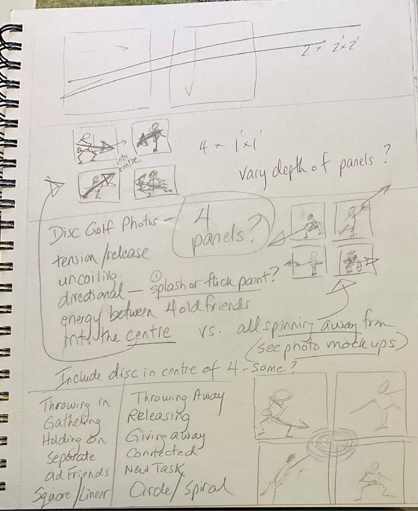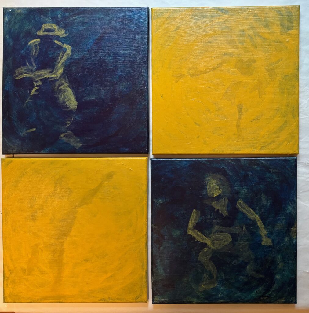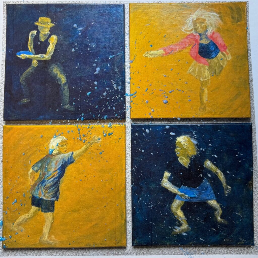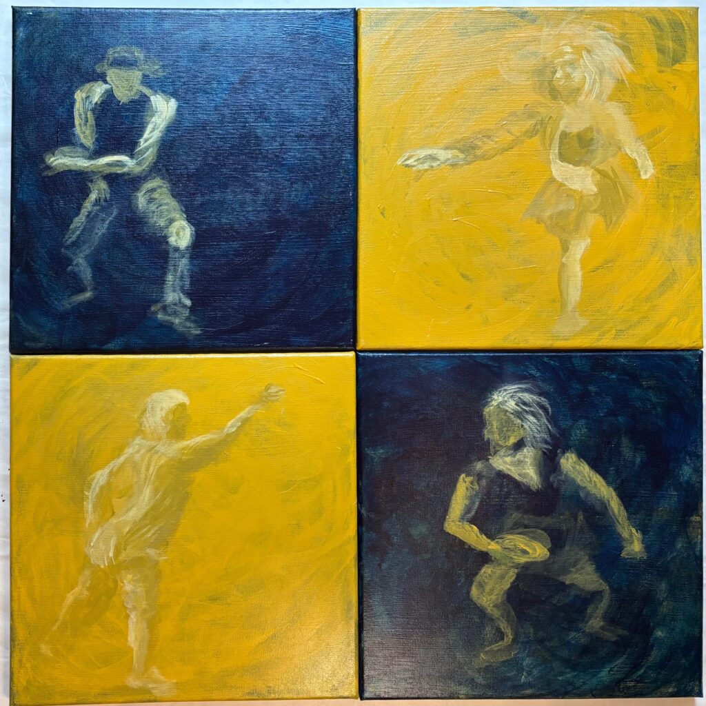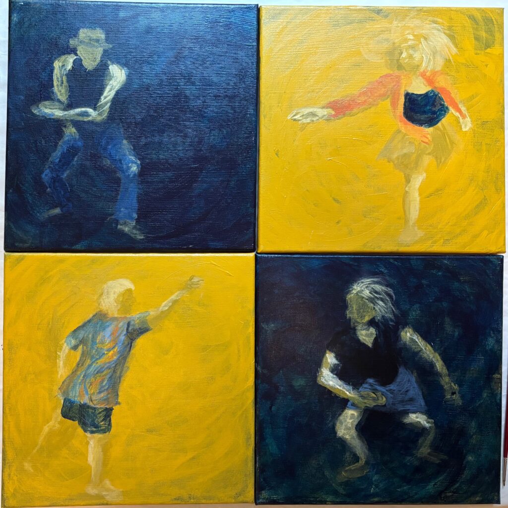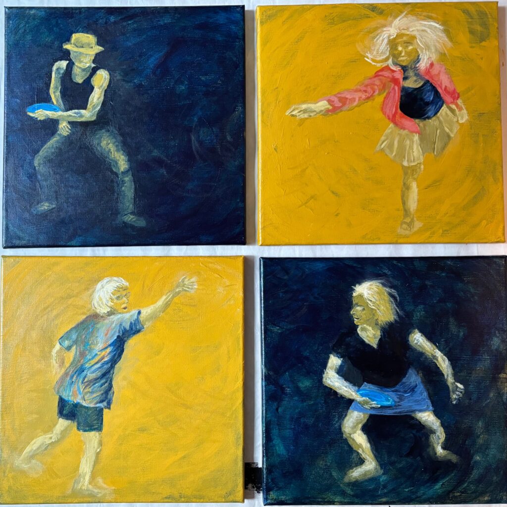 A few years back I gathered with some friends to try out disc golf — several of us took photos and they ended up with those coiled tension / release poses, like a dancer or a spinner. Decided to crop the photos and see how they fit. I have 4 small canvases, each 12 inches square, and would like to try making a multi-piece work as shown below…