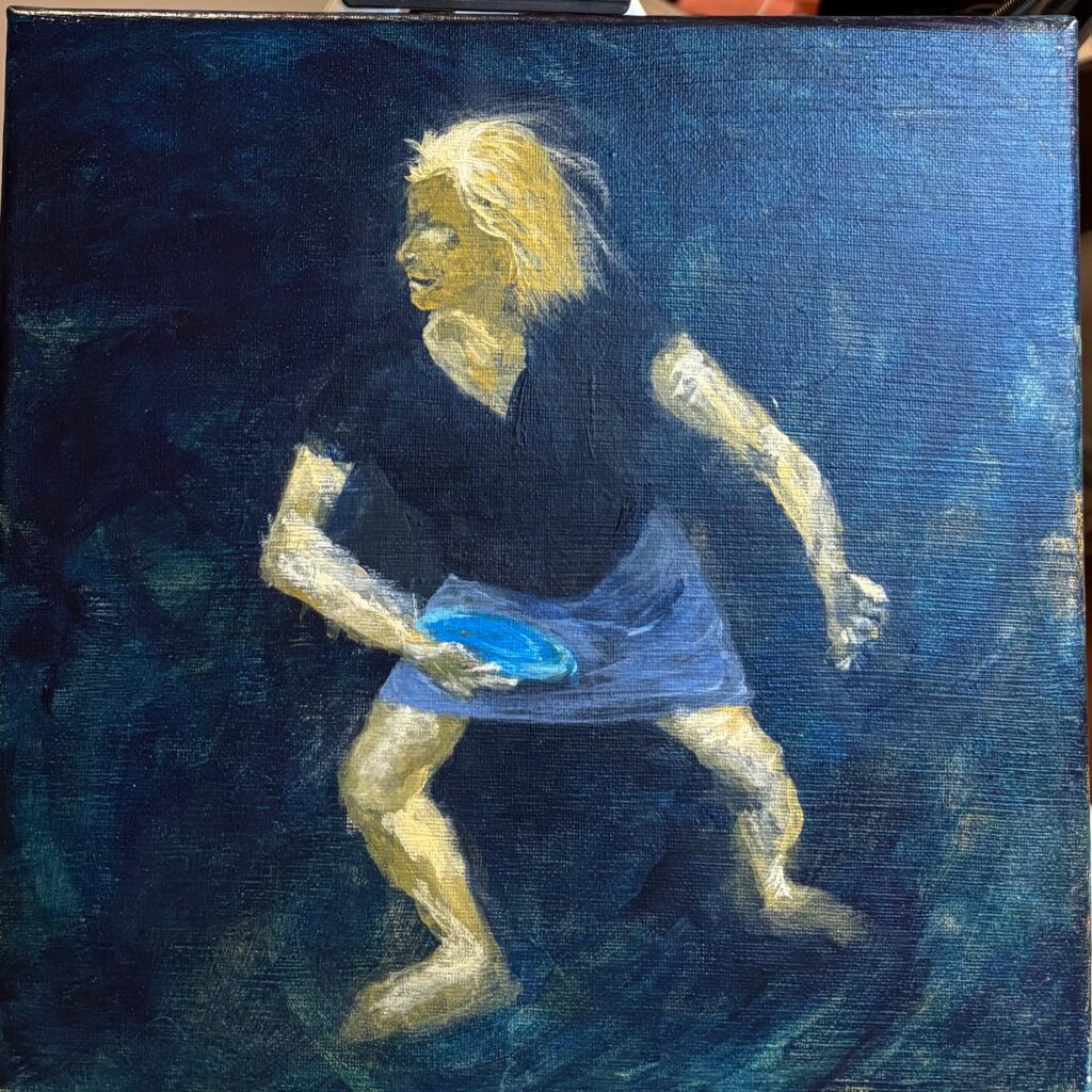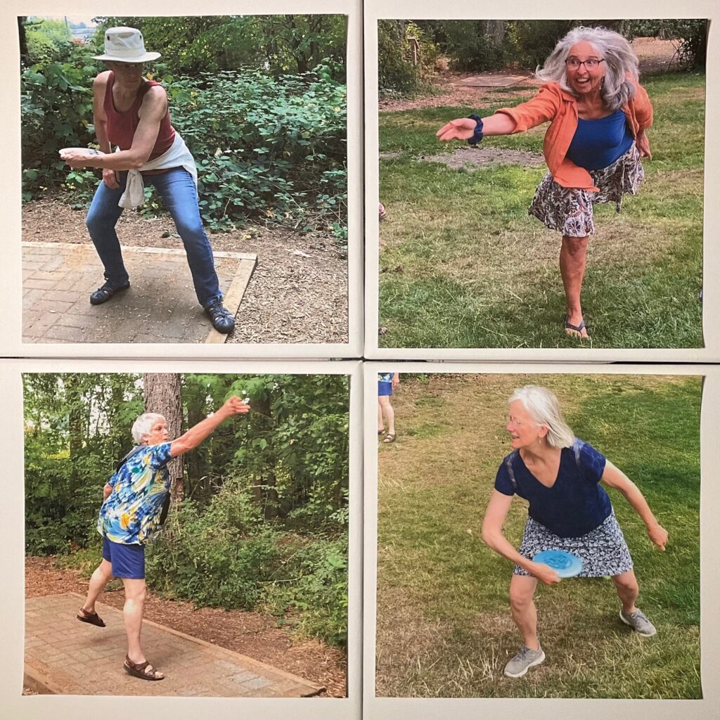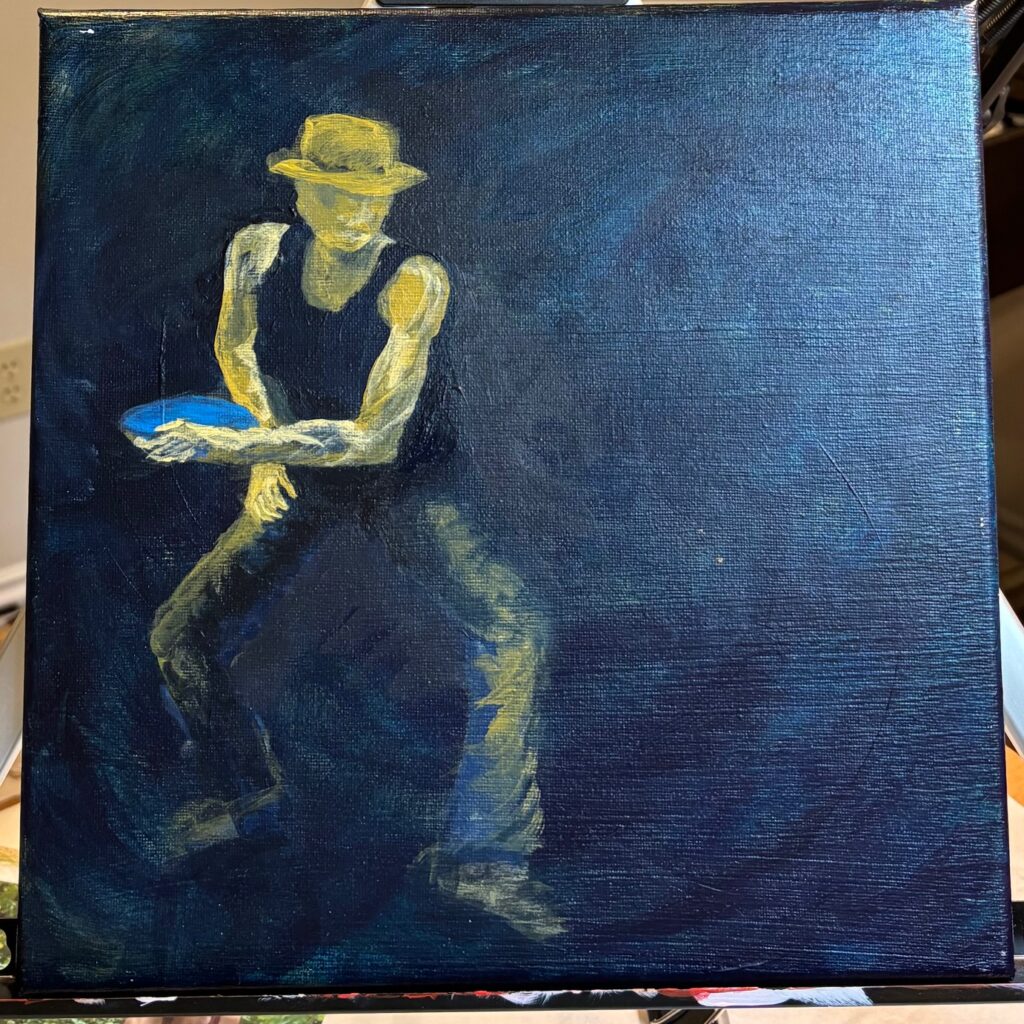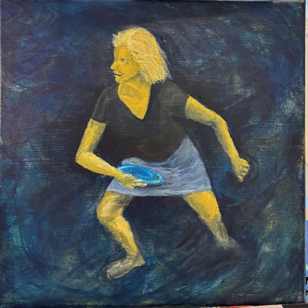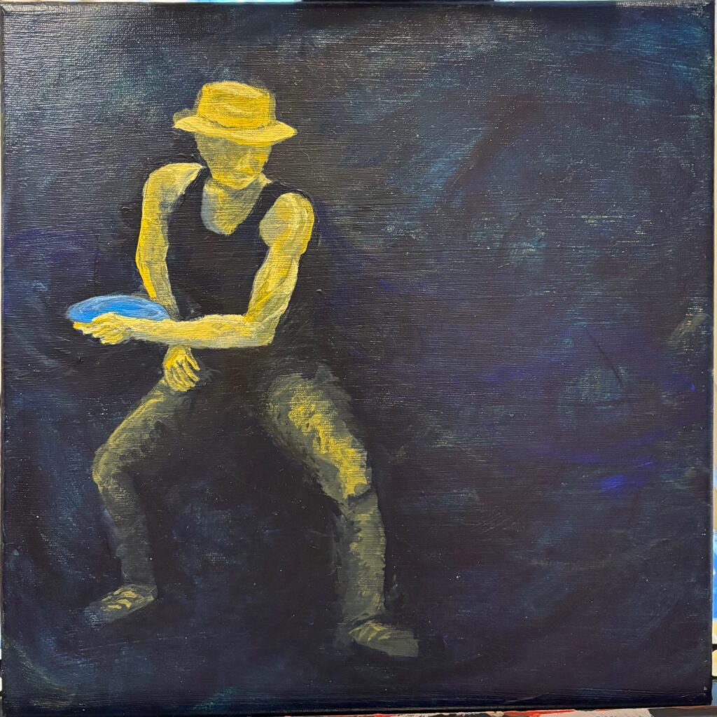 A few years back I gathered with some friends to try out disc golf — several of us took photos and they ended up with those coiled tension / release poses, like a dancer or a spinner. Decided to crop the photos and see how they fit. I have 4 small canvases, each 12 inches square, and would like to try making a multi-piece work as shown below…