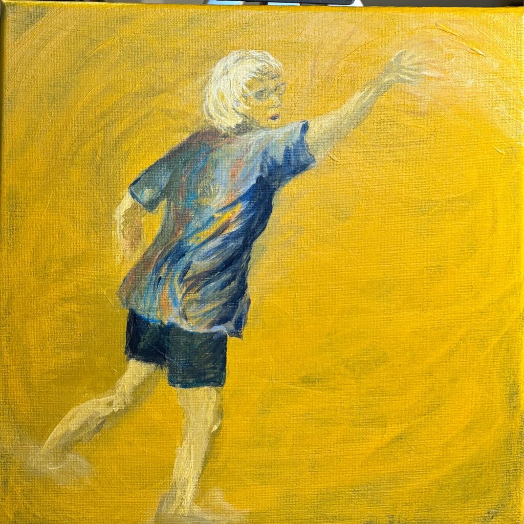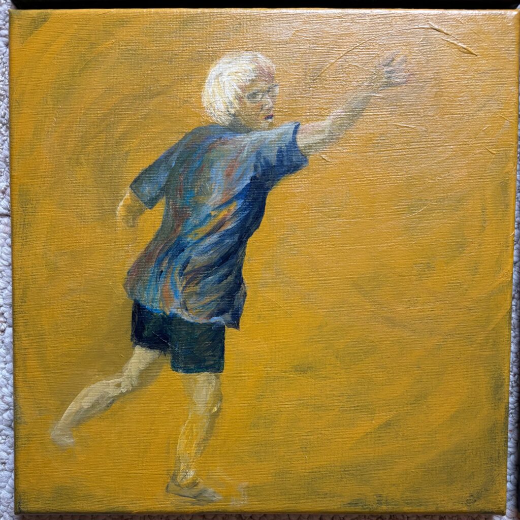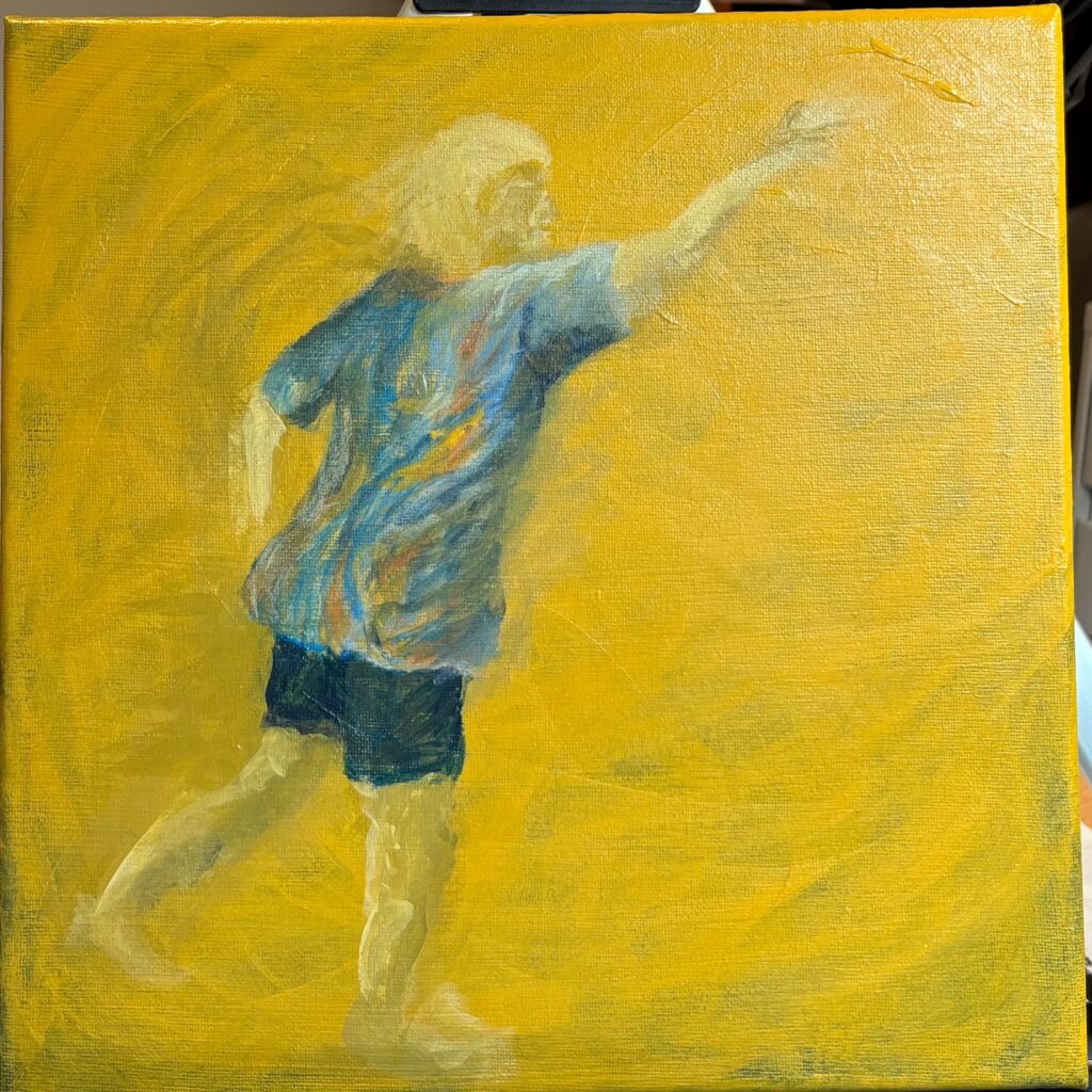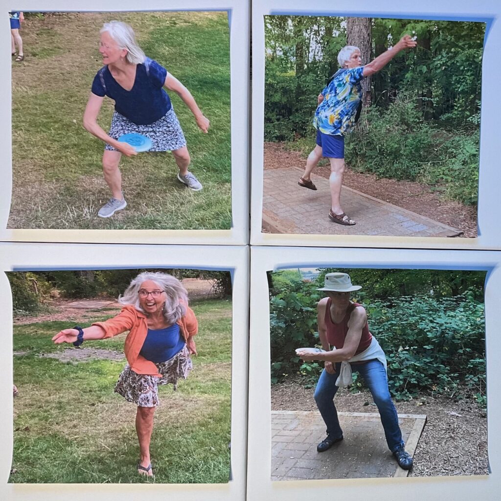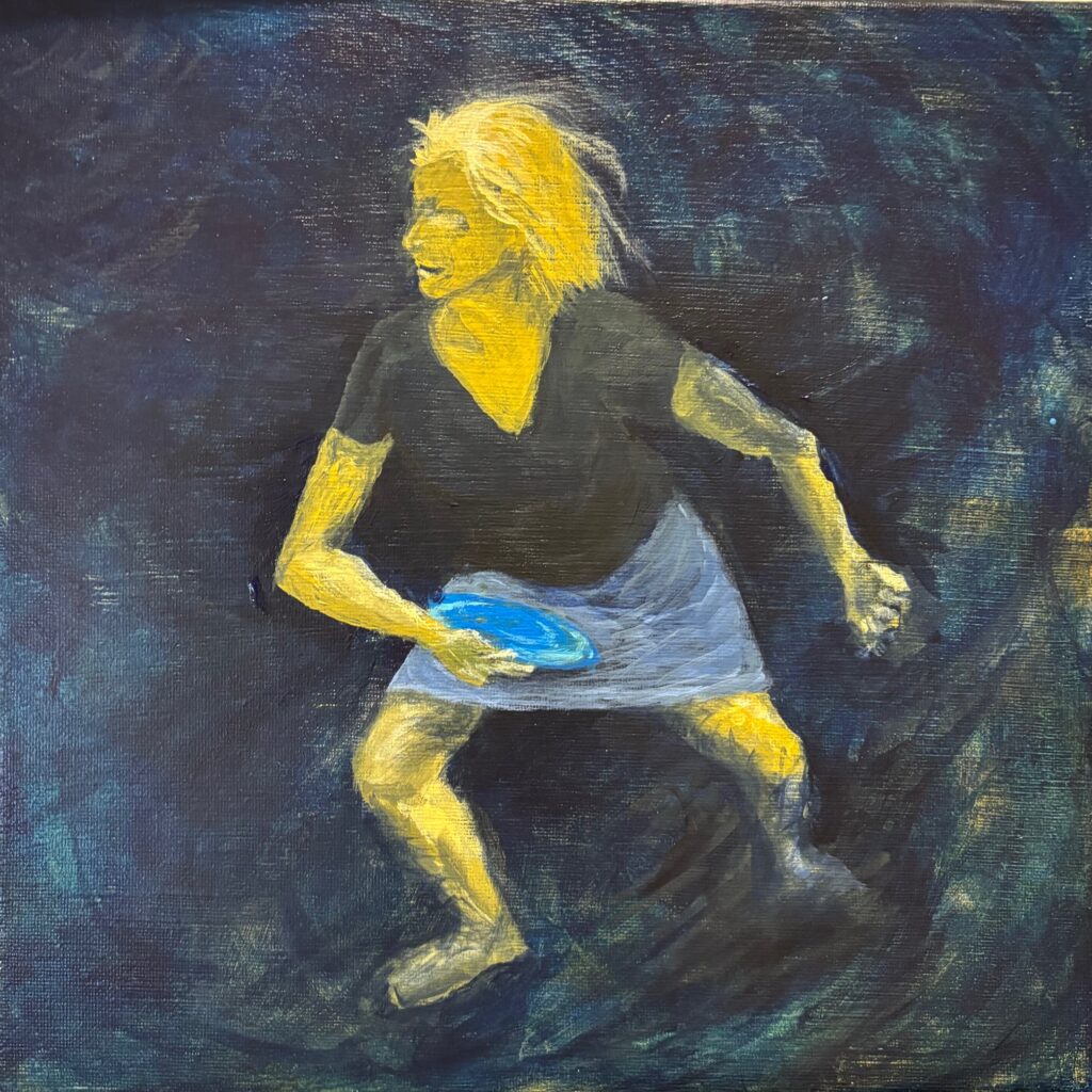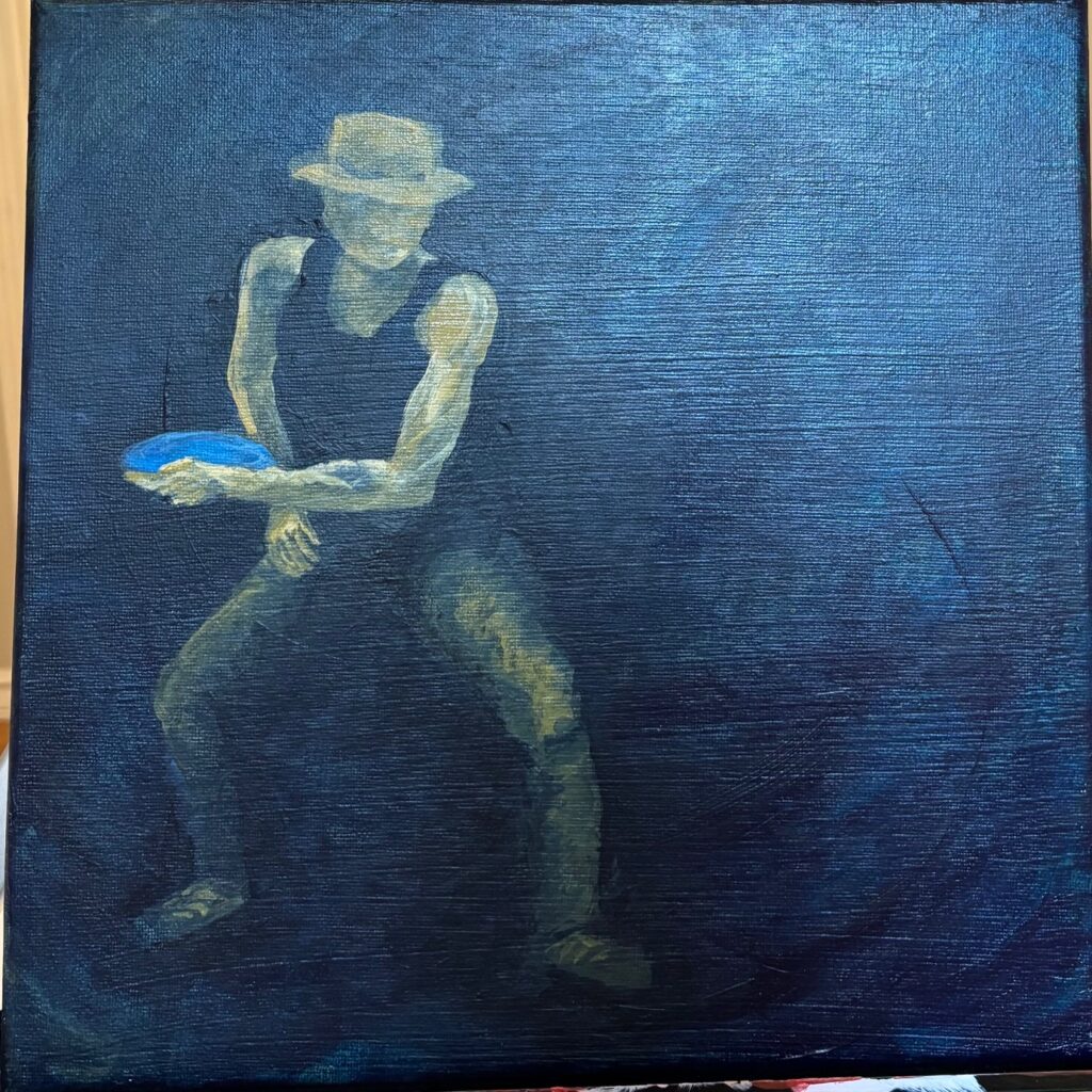 A few years back I gathered with some friends to try out disc golf — several of us took photos and they ended up with those coiled tension / release poses, like a dancer or a spinner. Decided to crop the photos and see how they fit. I have 4 small canvases, each 12 inches square, and would like to try making a multi-piece work as shown below…