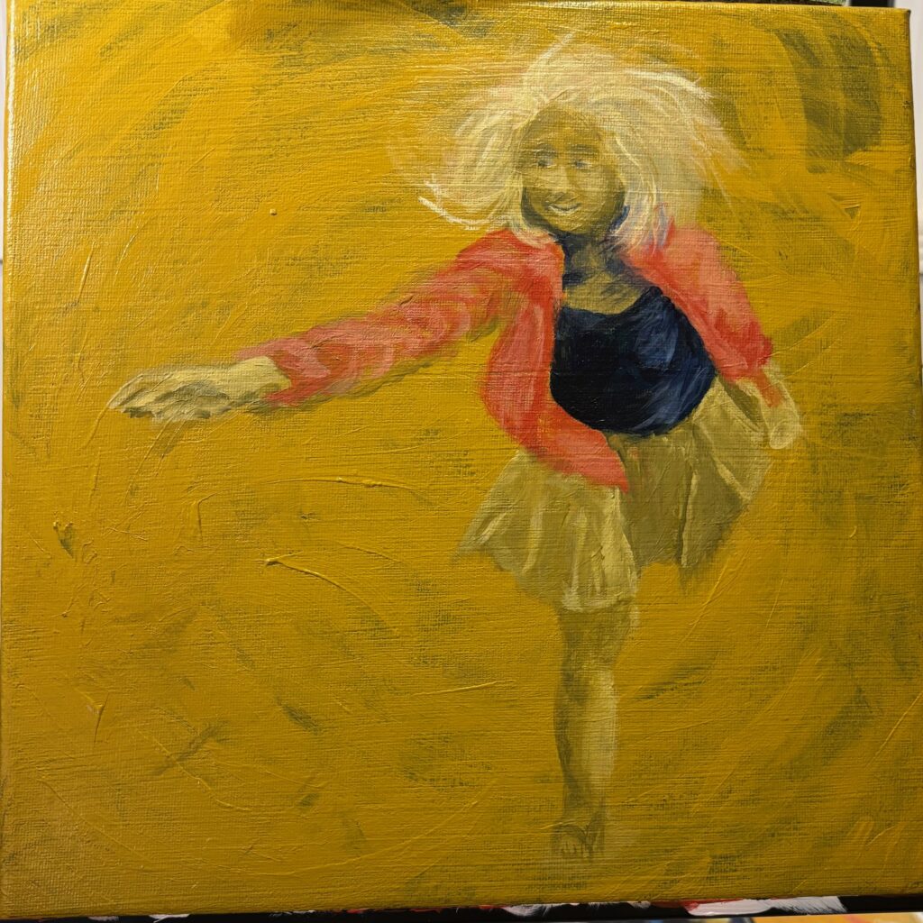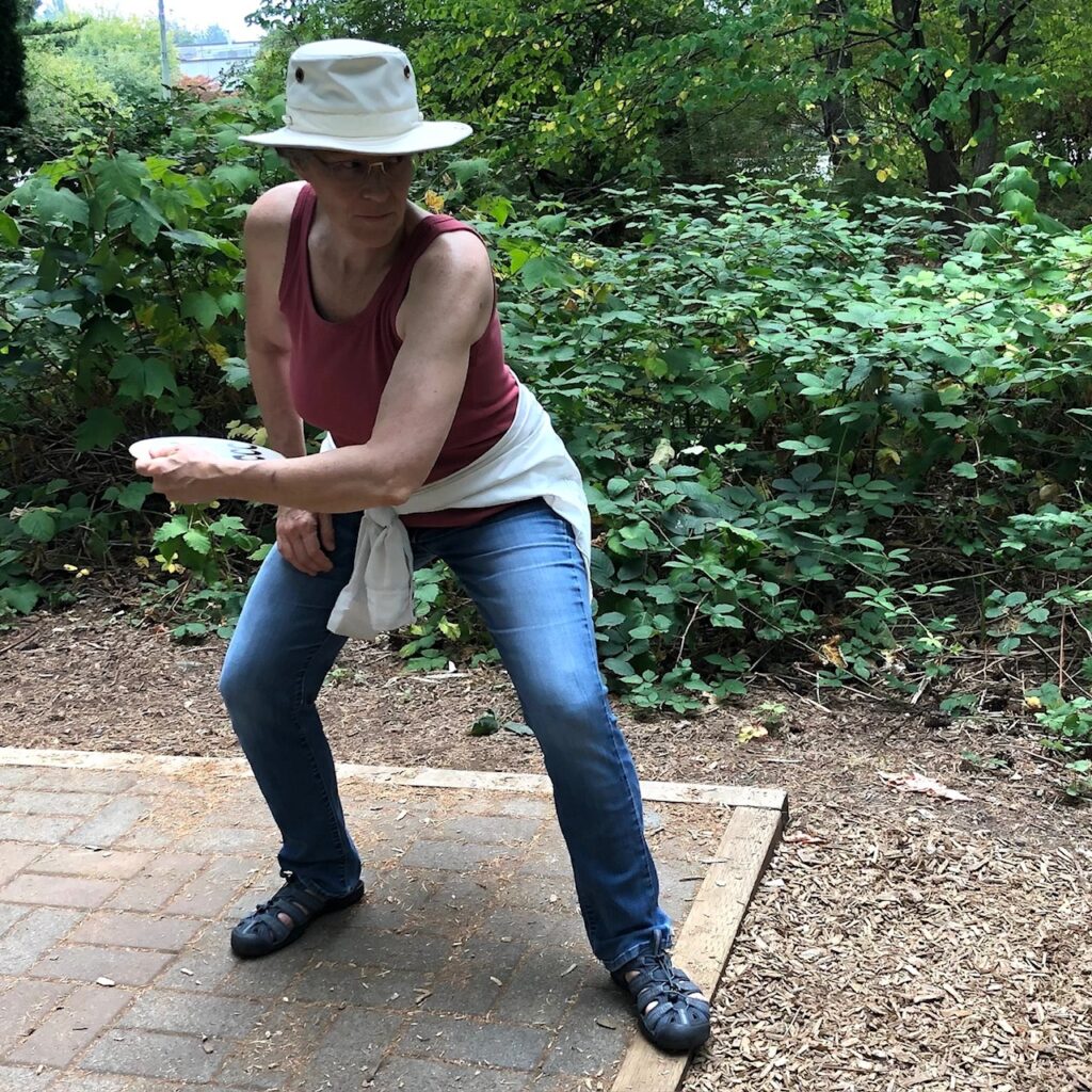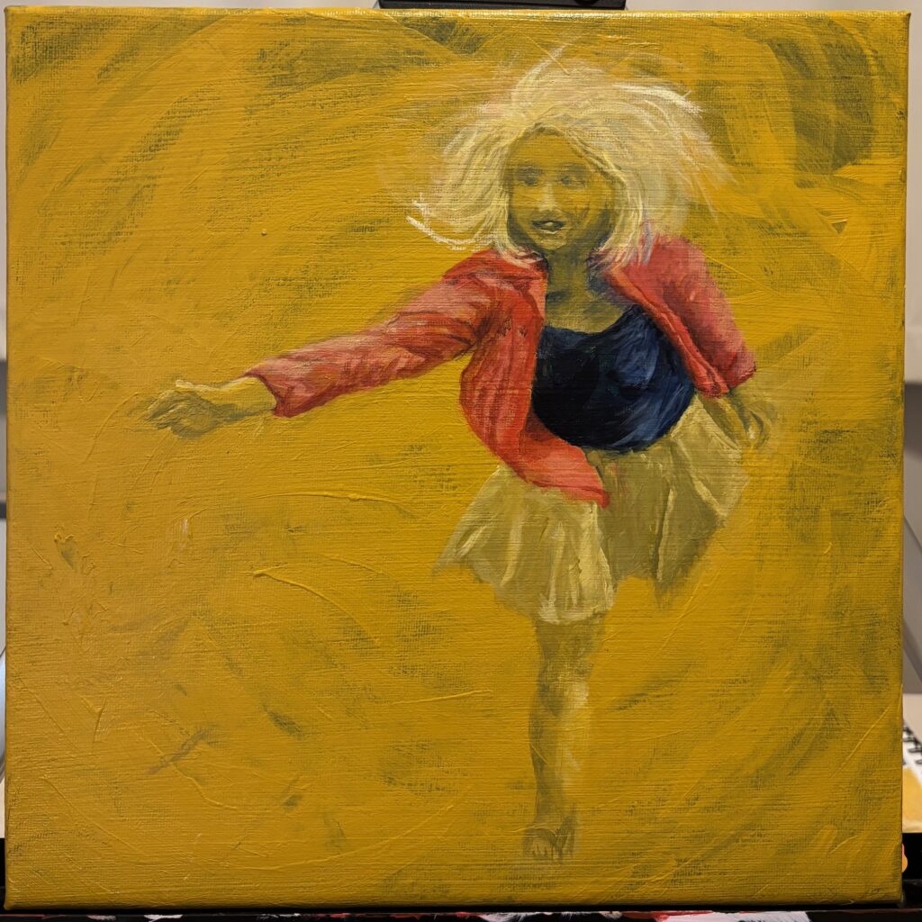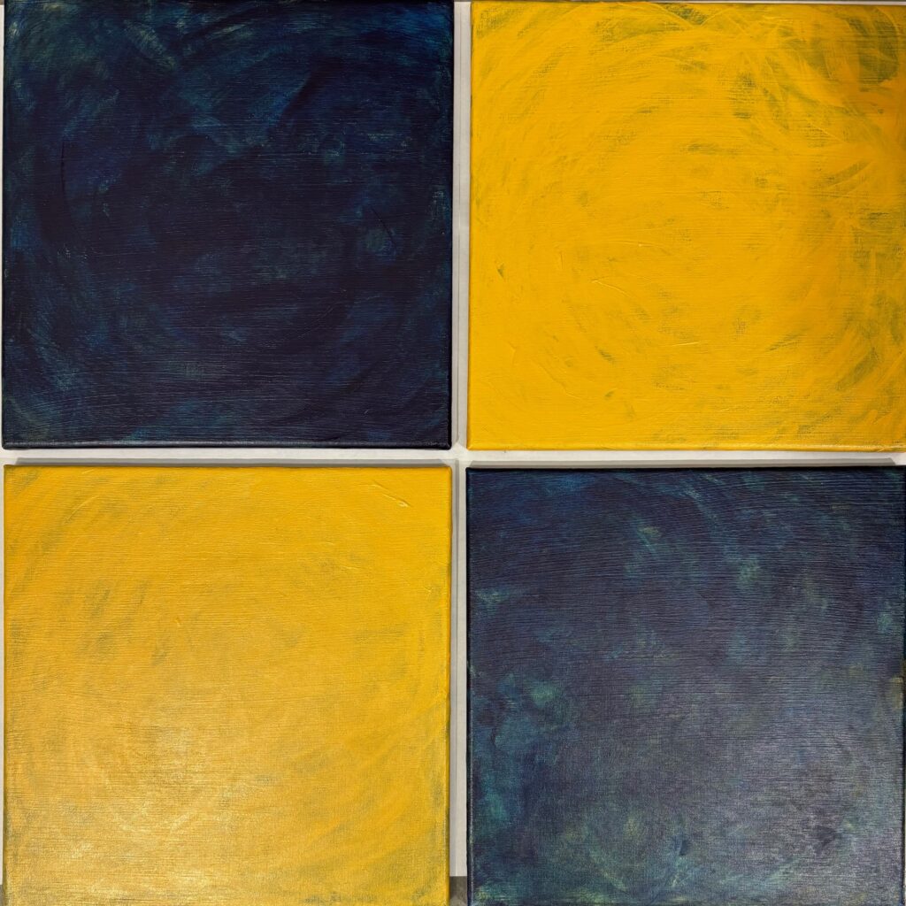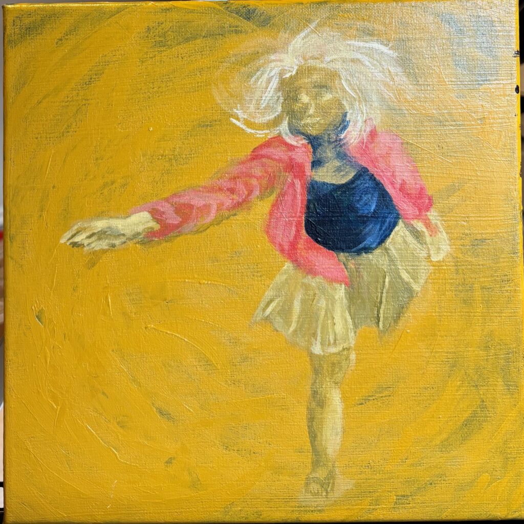 A few years back I gathered with some friends to try out disc golf — several of us took photos and they ended up with those coiled tension / release poses, like a dancer or a spinner. Decided to crop the photos and see how they fit. I have 4 small canvases, each 12 inches square, and would like to try making a multi-piece work as shown below…
