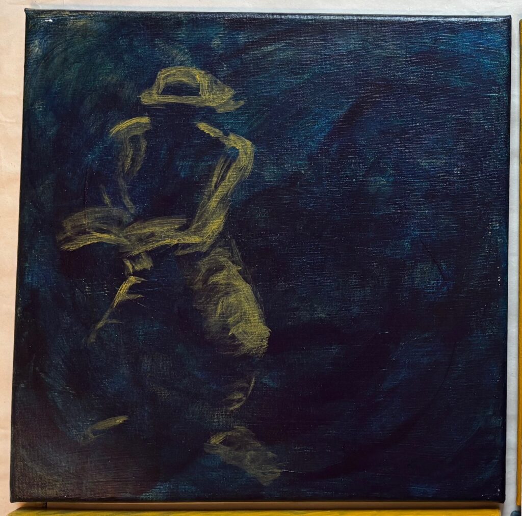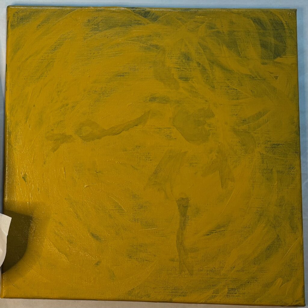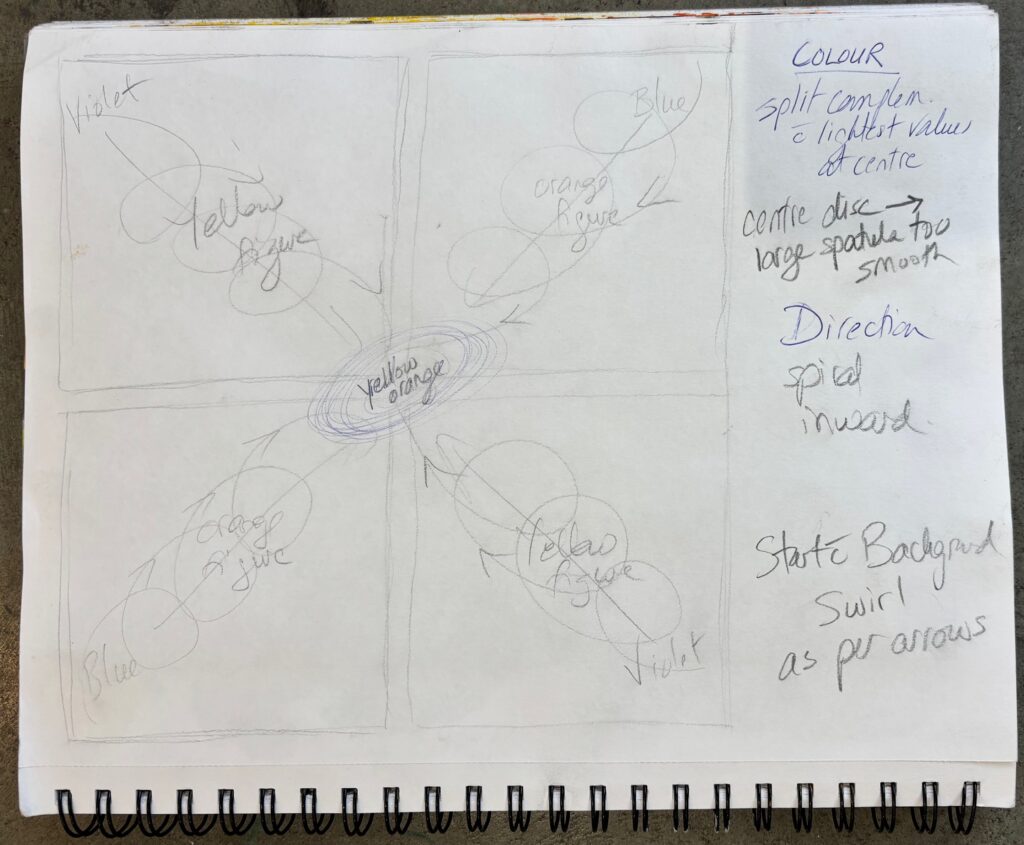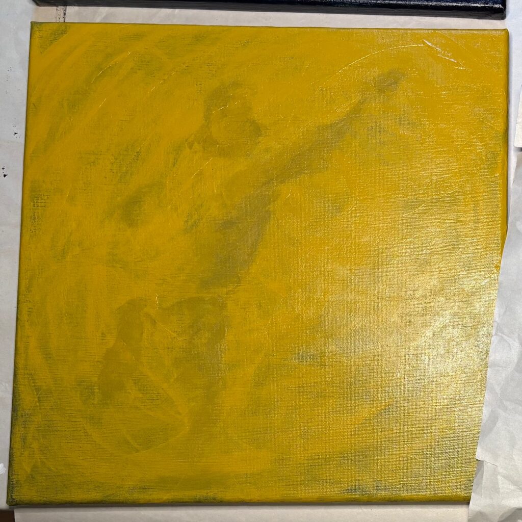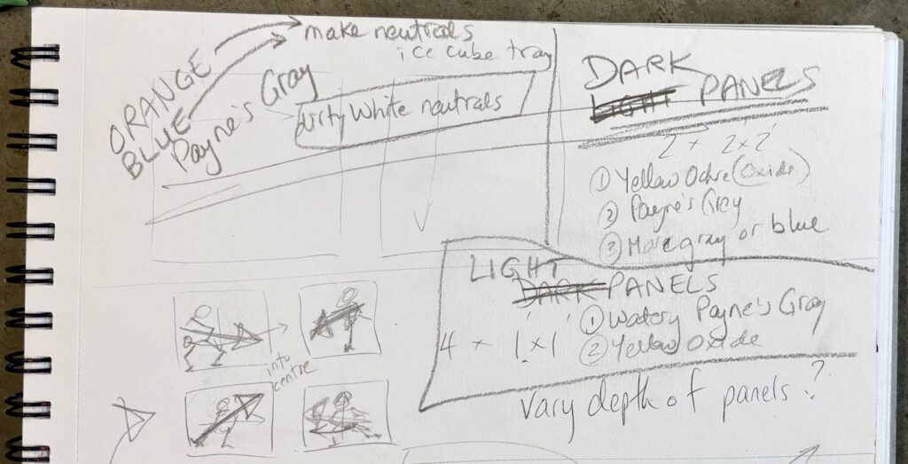 Working plan for paint application (interesting to see if it goes as planned!!) : 1) large brush swirling application for background, removing as well as adding the surface colour with dilute paint and covering same ground repeatedly. 2) Switch to med brush size for gestural drawing (2 min) each figure, in colour barely different from background. 3) Switch again to small size applicator (brush and/or palette) for shadows in grey blue (on the yellow panels) or highlights in yellow (on the grey blue panels). 4) Final spatter / flick paint to make drip trail that crosses between panels?? (Risky!)