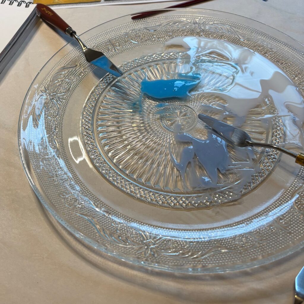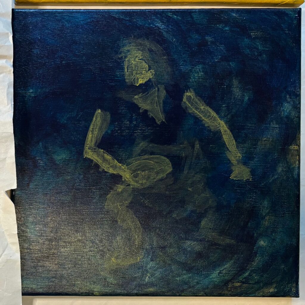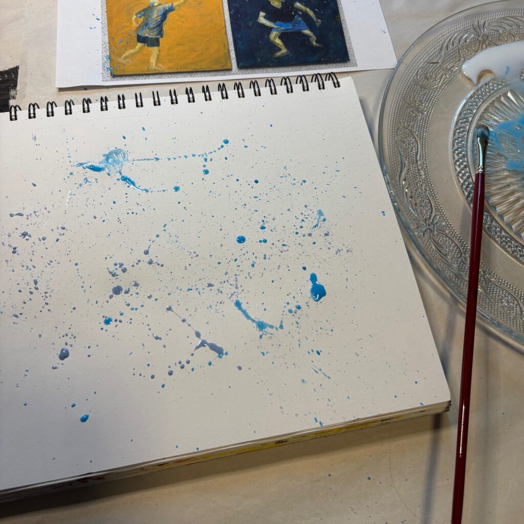 Further activating the figures — trial spatter paint. I mixed acrylic medium with two colours (phthalo + white; payne’s grey + white) and trialed spatter technique (shaking, tapping, running my finger across the loaded bristles) with a few different brushes on plain paper and over a photograph of my work in progress. Learned it is really hard to control direction — perhaps I would need a larger canvas to use this effectively? The photo I used is small (perhaps 15 to 20% of full size) so doesn’t give accurate scale of the drops to the figures, but still not convinced. I do like the bumpy texture that results, though. See below…