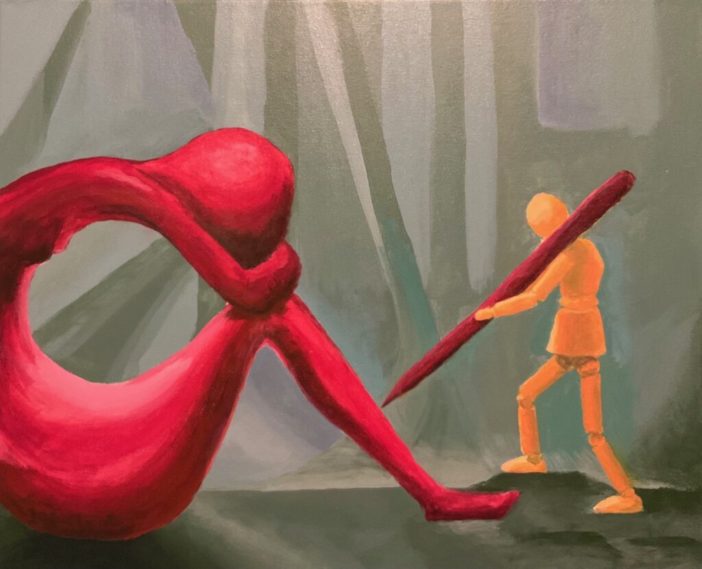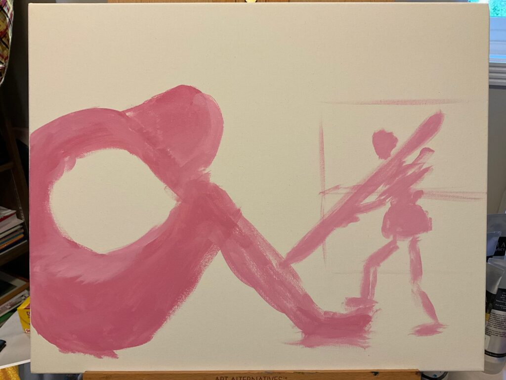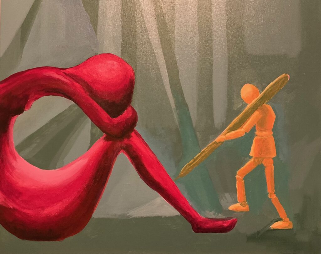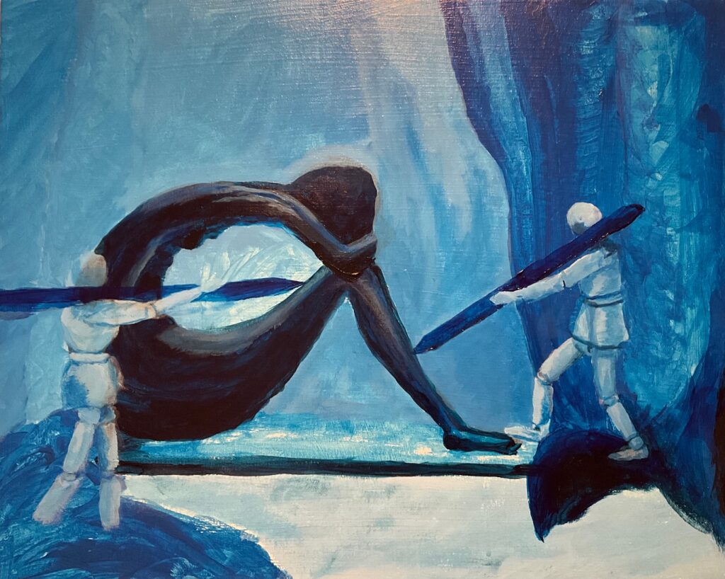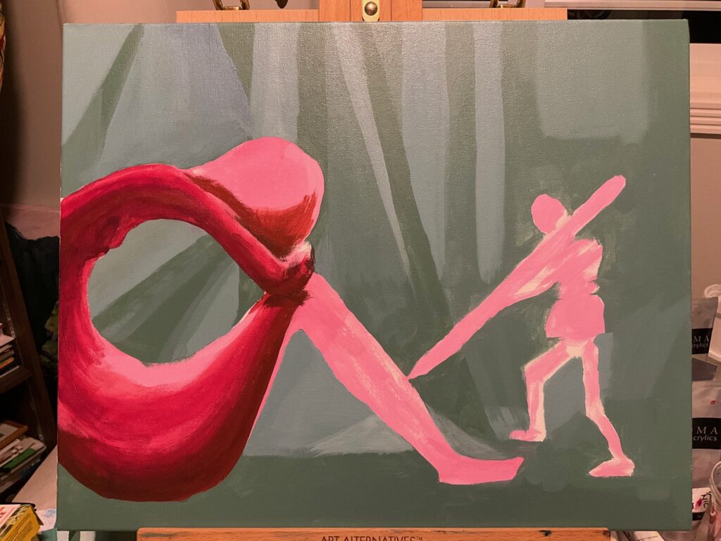 VERSION 2: “So Blue“. Settled on monochromatic blue for this version, and I want to dig into sad mood for the model. A similar crop for the figures but a landscape orientation giving much less background, much more about the figures. See working photo crop below. I used 16 x 20 canvas, phthalo blue +/- white and black, and took a stab at wet-in-wet blending, also making use of the acrylic paint extender to lengthen the time the paint was blendable. I used 2 brush sizes, small and medium, and blended also with my fingertips and with a cloth. Also decided to omit the “cloud” over the statue’s head, finding it was not so successful with the first one, and verges into a cartoon aesthetic.