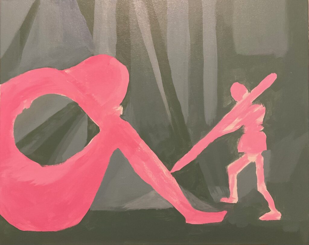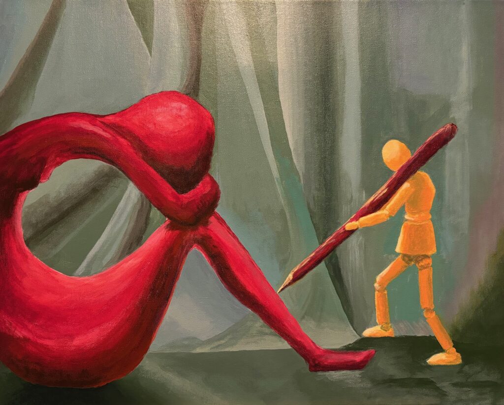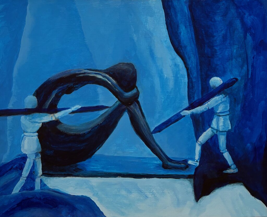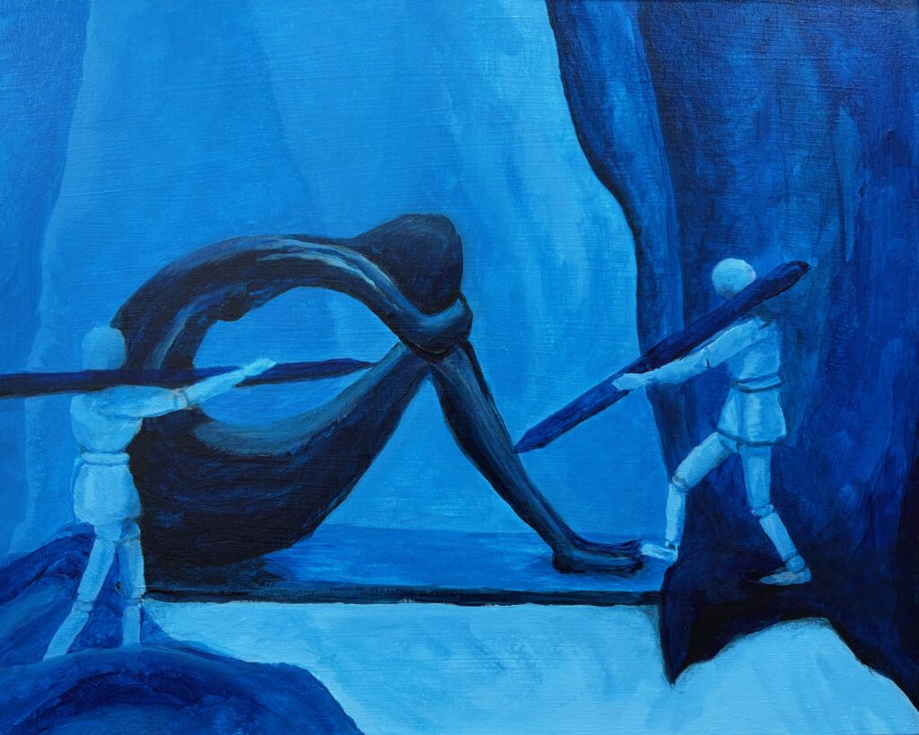 VERSION 2: “So Blue“. Settled on monochromatic blue for this version, and I want to dig into sad mood for the model. A similar crop for the figures but a landscape orientation giving much less background, much more about the figures. See working photo crop below. I used 16 x 20 canvas, phthalo blue +/- white and black, and took a stab at wet-in-wet blending, also making use of the acrylic paint extender to lengthen the time the paint was blendable. I used 2 brush sizes, small and medium, and blended also with my fingertips and with a cloth. Also decided to omit the “cloud” over the statue’s head, finding it was not so successful with the first one, and verges into a cartoon aesthetic.