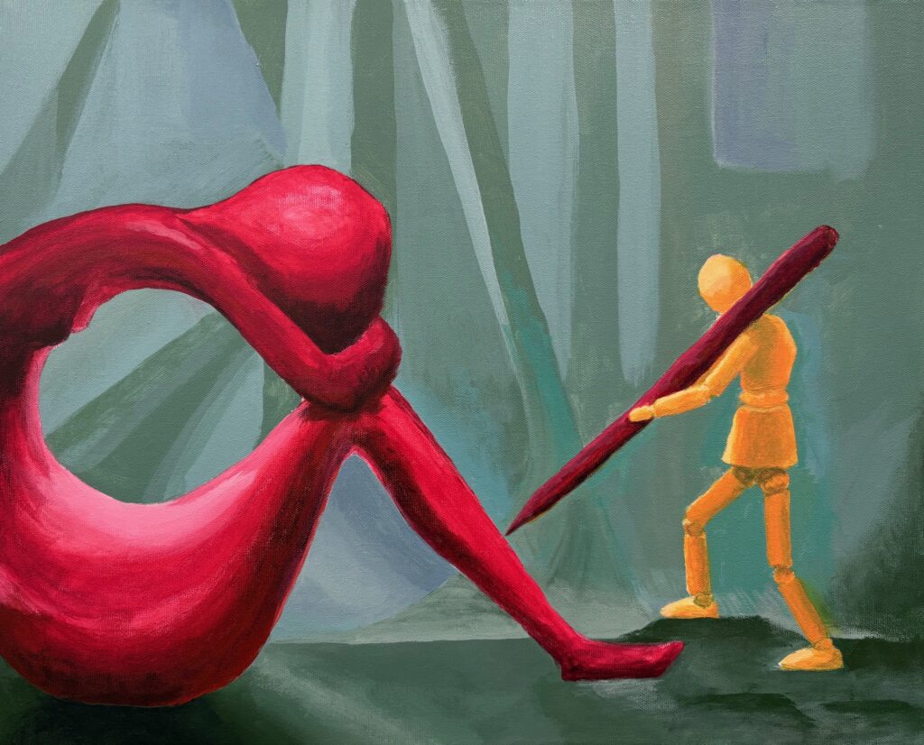 POST-CRITIQUE: I worked further on version 3, adding the intended shading to shape the background drapery in a geometric fashion, changing highlights on figures and pen, and incorporating touches of the red/orange into the background drapery for more cohesiveness. See below, final version: