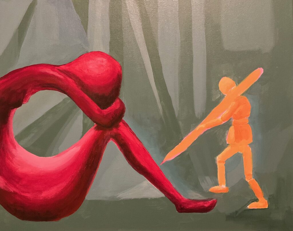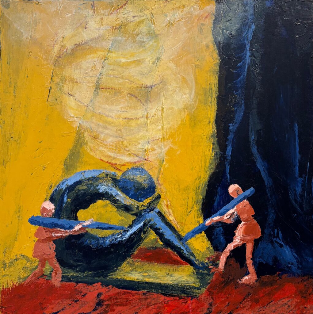 Learning from first version — as noted above, I had trouble with large trowels on the slightly baggy canvas. I tried switching to smaller (2-inch) trowel but then the drapery had a strange bamboo-like segmented appearance. Will try on board (or a canvas that is stretched much more taut) next time I try large trowels. Also — used palette knives for the smaller figures but even so, the tool was quite coarse for the way I’d imagined the wooden figures would look. Got a little too fussy trying to make details that would make sense of these small figures, paint got globbed on, bumpy, hard to control. Palette knives several sizes worked well for the larger statue. I went back in to background area with smaller palette knives to add some depth and contour. Then tried adding an ill-defined version of the wire shapes over the statue’s head. Initially, brown/red lines as shown above in final panel, with small paintbrush. Then went back in to soften and make more ethereal with very watered-down yellow oxide +/- white or payne’s grey, this applied with a fingertip. See below for final version… time to leave this first version and move on…