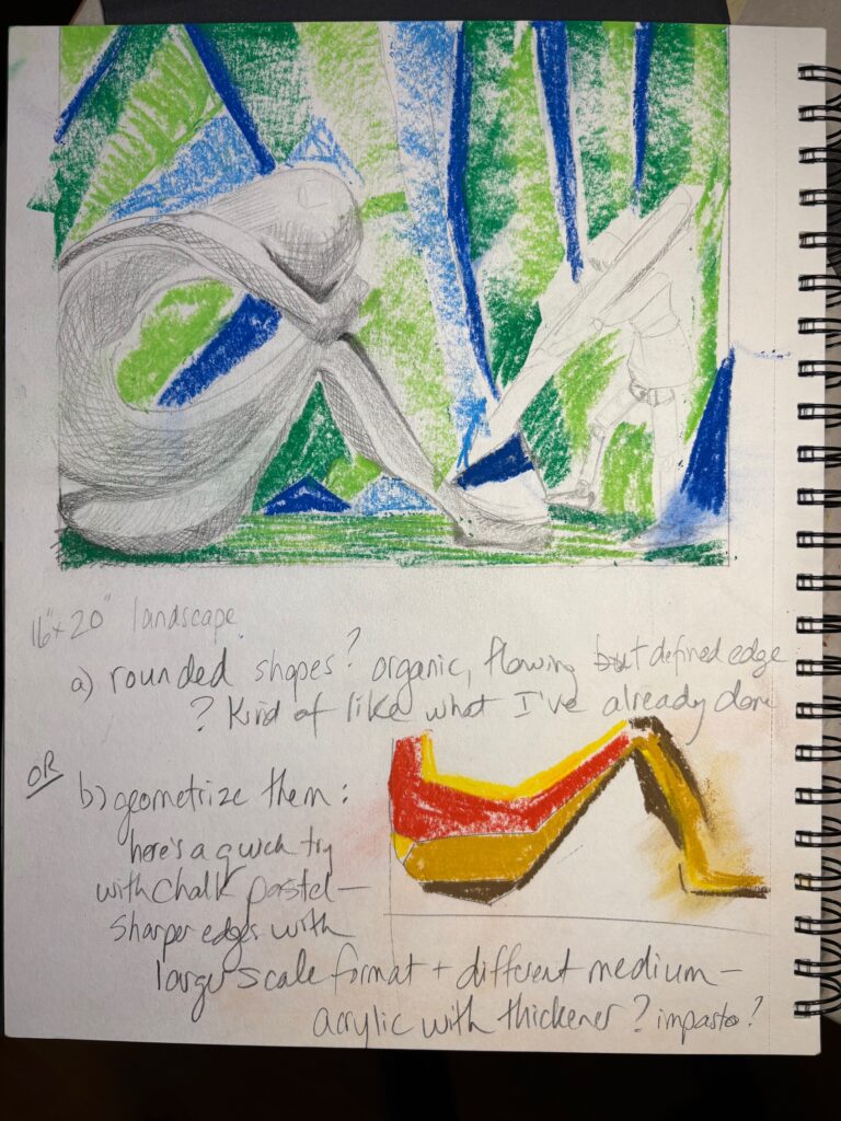 CRITIQUE SHOWING AND FEEDBACK: See below, photos of the 3 paintings at Critique. Feedback from peers and instructor: Version 1: appreciation for texture decisions., the white fog over the statue is too chalky. Version 2: good composition and cropping decisions, good range of monochromatic blues. Version 3: the cropping of the red figure is abrupt — consider including the whole figure, or soften her left edge or soften the bright highlights on her lap.