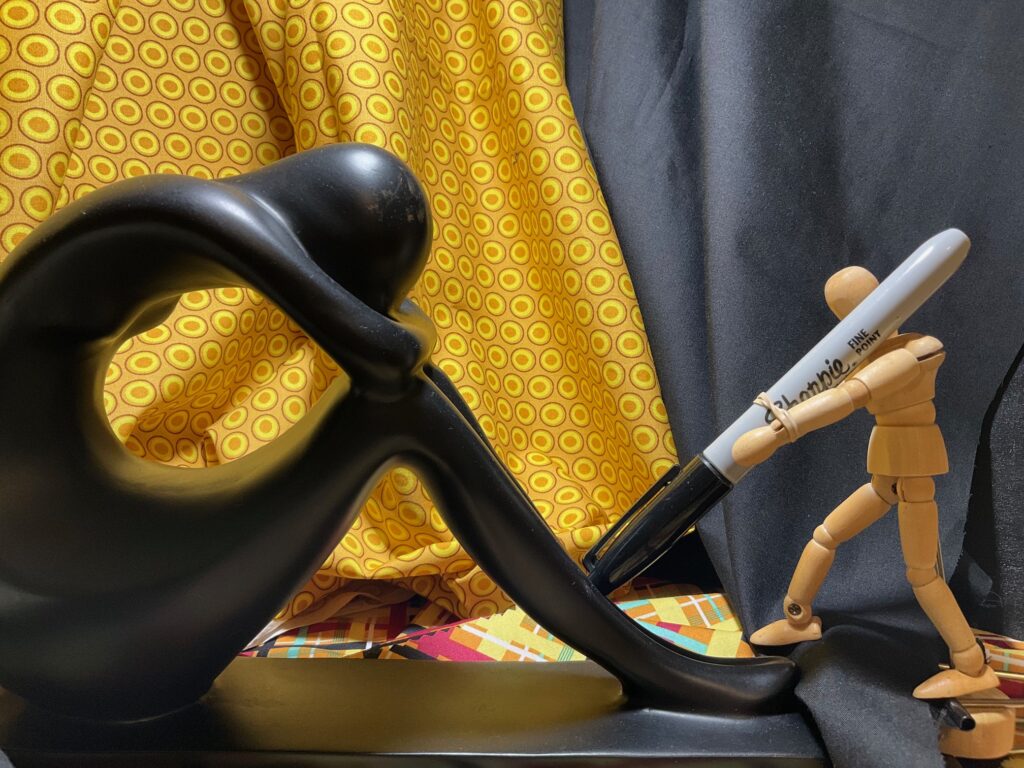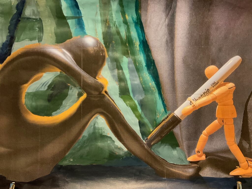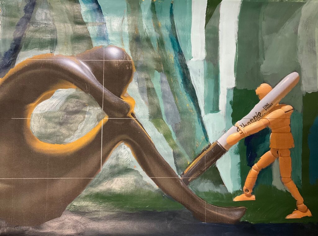 It will be a challenge for me and I think I will reduce the number of items. One wooden dummy, one statue, one pen, and some drapery. I am thinking of split complementary– blue greens as the background, the figures in red/orange. Trying to decide if Metzinger-like background uses his geometric blocks or goes with more curvilinear shapes — so I painted out two different halves directly on to a printed photo of the still life. Preferred the geometric background, curvilinear blending on the figures. See below, a photograph of my planned composition/cropping and the background test runs.