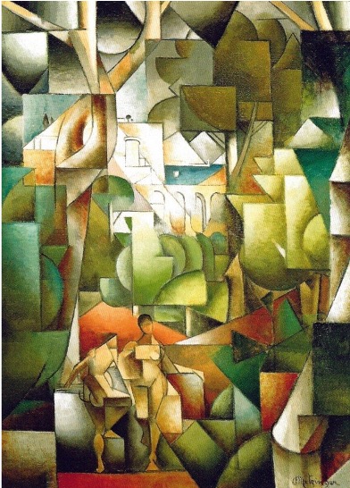 VERSION 3: “So What”. I’d like to attempt a more abstracted version of the still life for this one. I see a set of geometric shapes that are simplified in the statue and the wooden dummy, but distorted in the drapery and table surfaces (imagining Metzinger cubist ideas, as shown below, although I have the disadvantage of no real shapes in my background, just drapery).